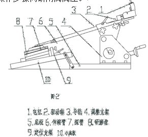 2.用底板前的两个螺钉帽和定位支架把要研磨的阀板固定好,并用小底板依所研阀芯调整好角度(以万向节不弯曲转动为佳)。如果阀板较大在底板上不便固定,可把调整支架反向安装,把要研磨的阀板放在一个合适的平板上。